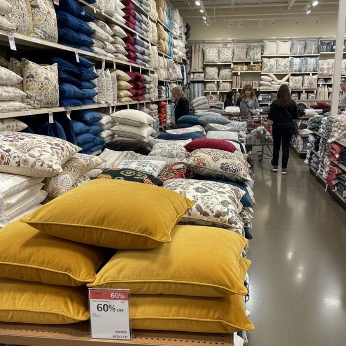 The moment I walked in, I was surrounded by aisles of velvet pillows, embroidered covers, chunky knits, jewel tones, neutrals, and patterns I didn’t even know existed. Everything looked beautiful under the store lighting, and of course the giant red sale signs made everything feel urgent and irresistible.