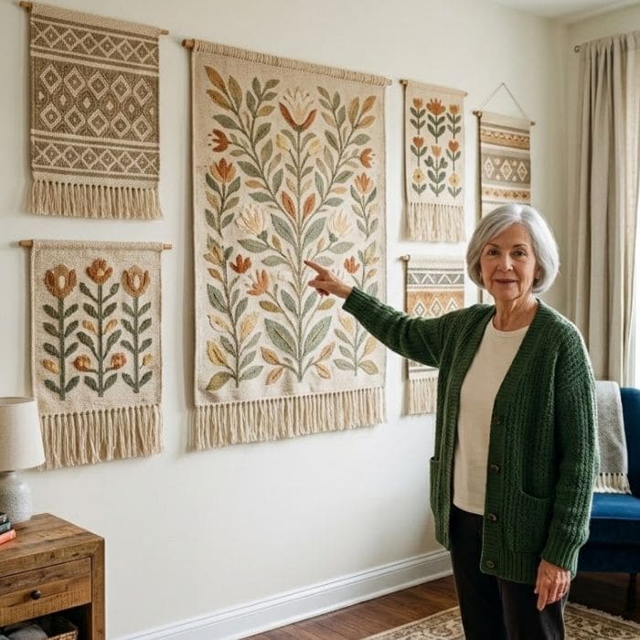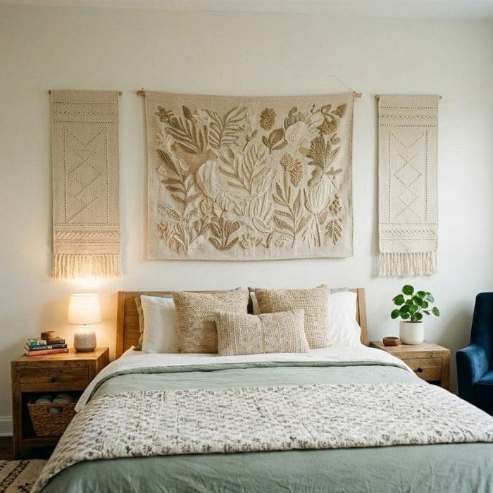 Instead of heavy framed artwork, she had tapestries with woven textiles in warm neutral tones, some with botanical patterns, others with subtle geometric designs.