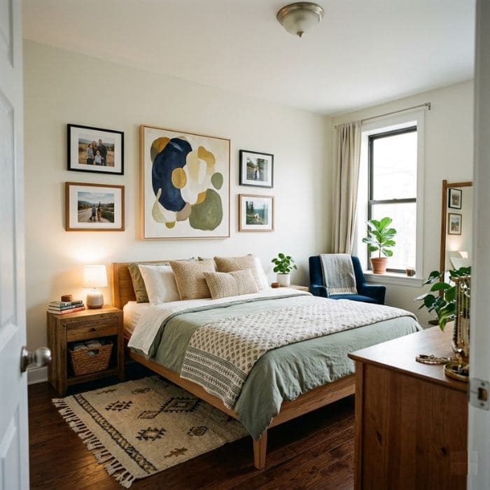 I relocated heavier pieces to interior walls less affected by exterior moisture. But in the bedroom, softness now makes more sense than structure.