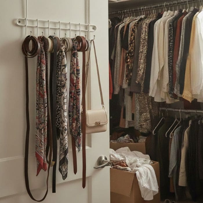 I added a narrow over-the-door rack with hooks, perfect for belts, scarves, small handbags, and even the delicate necklaces I want to keep from tangling.