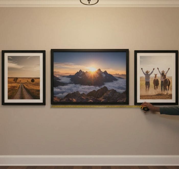 We left 3½ inches of space between each frame, enough to give the images room to breathe without creating too much separation. I prefer groupings that feel connected but not crowded, especially in narrow spaces.
