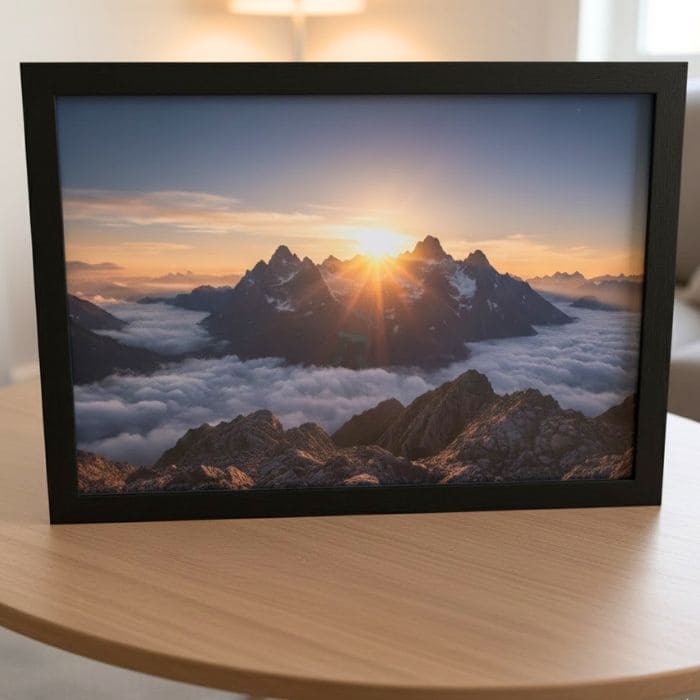 The first frame held a sunrise mountain photograph, taken on a cold morning when we woke before dawn just to watch the world slowly change its colors.