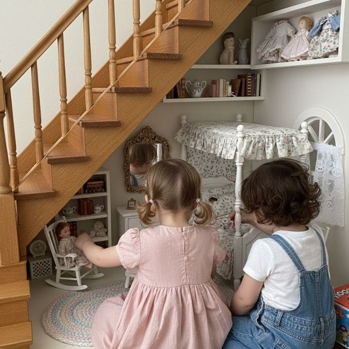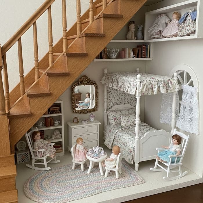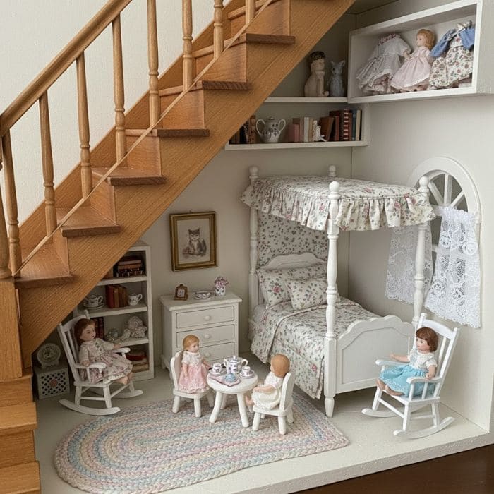 The staircase nook, once ignored, is now one of the most cherished areas in our home, holding tiny furniture, tiny books, and very real memories.